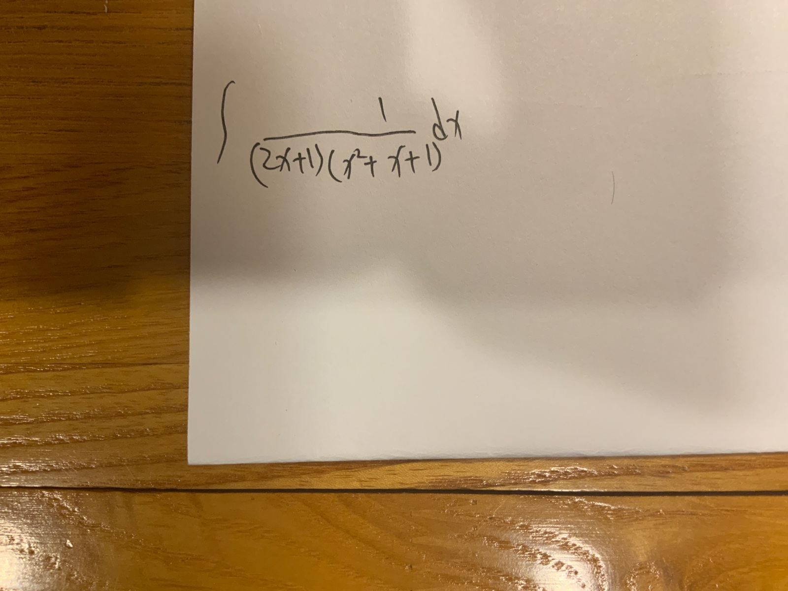 \frac{1}{(2x + 1)(x^2 + x + 1)} = \frac{A}{2x + 1} + \frac{Bx + C}{x^2 + x + 1}