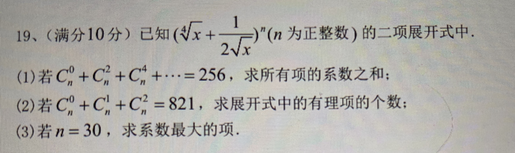 (1) 若 $C_n^0+C_n^2+C_n^4+\cdots=256$, 求所有项的系数之和;